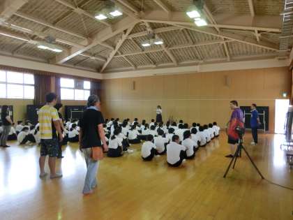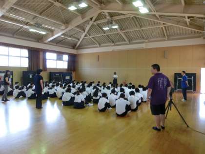 とても暑い格技室で集会が行われています。