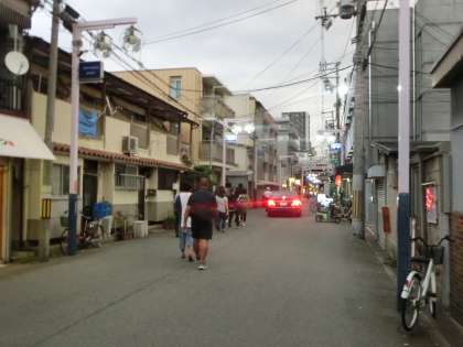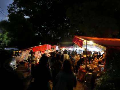 ようやく日が暮れ、夜店の明かりが輝きだしました。
