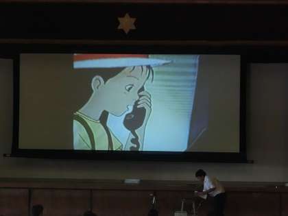 アニメ「つるにのって とも子の冒険」を放映し、みんなで朗読を。