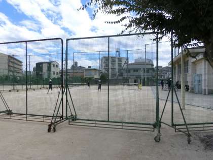 テニス部は、水分補給を取りながら、帽子をかぶって練習しています。