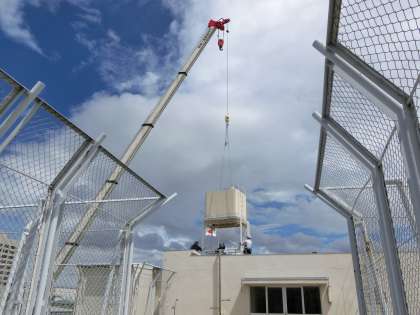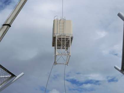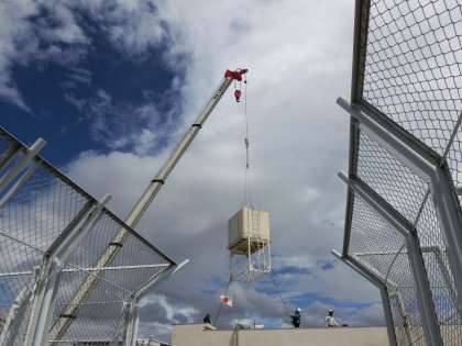 クレーンが伸びて、ついに上空に水槽が・・・。
