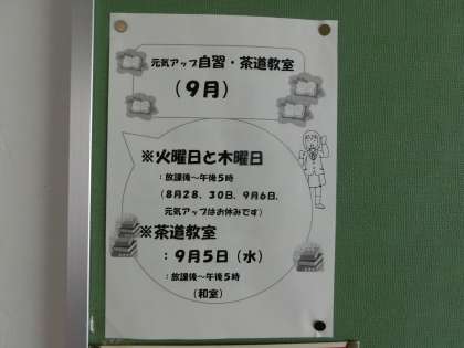 9月の自主学習、茶道教室の案内です。 積極的な参加をお願いします。