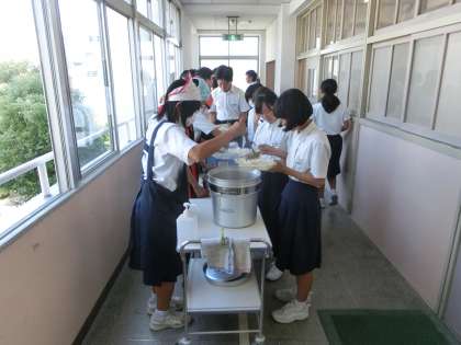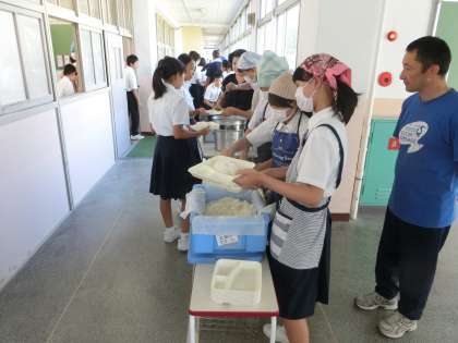 配膳当番が、てきぱきとご飯やカレー、ピクルスを器に。