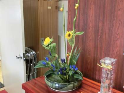 ひまわりから、秋のススキ、リンドウ、花茄子へ。