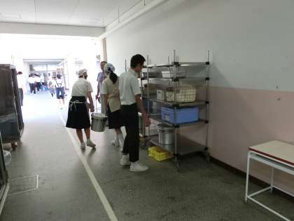 係生徒は、学年別の場所へ、食器や食材を取りに行きます。