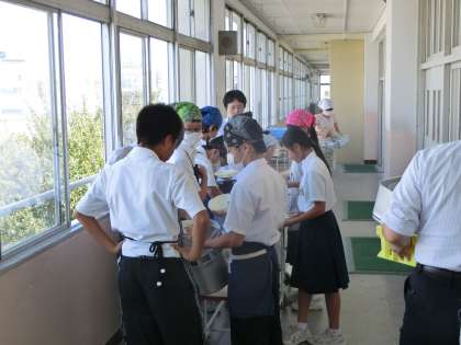 午前中の授業が終了し、給食の配膳が始まりました。