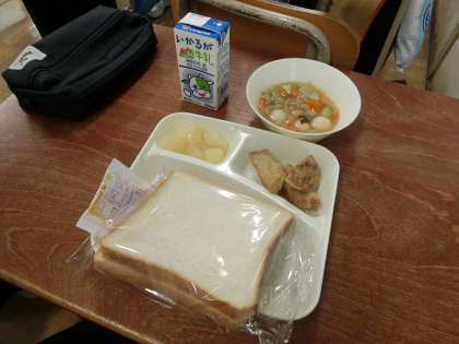 本日のメニューは、「揚げ餃子」「野菜たっぷりの中華煮」、そして「なしの缶詰」。