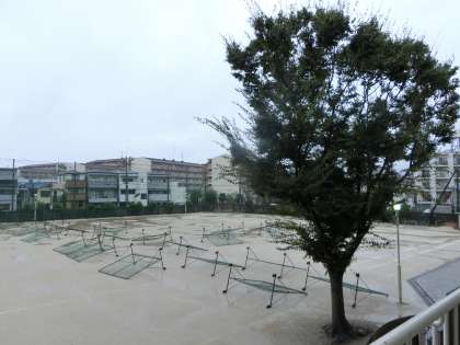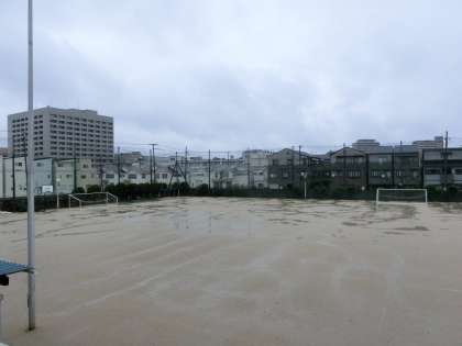 グラウンドの防球ネットが、暴風で飛ばされないよう、倒されています。