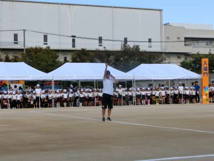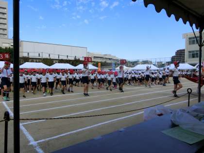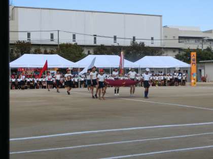 ピストルの合図で開会し、校旗を先頭に、児童会諸君、赤白の選手が入場してきました。