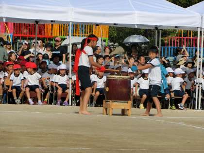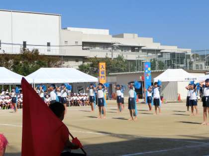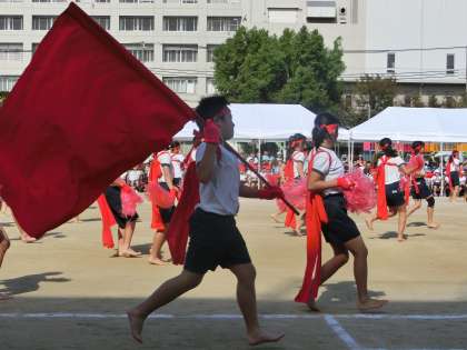 グラウンドいっぱいに、紅白の応援団が登場しました。