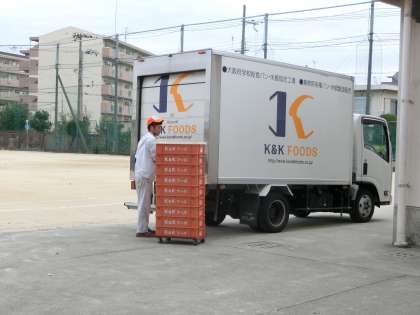 本日の給食は「パン」 早くもトラックが到着しました。 朝早くから、ありがとうございます。