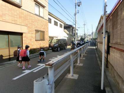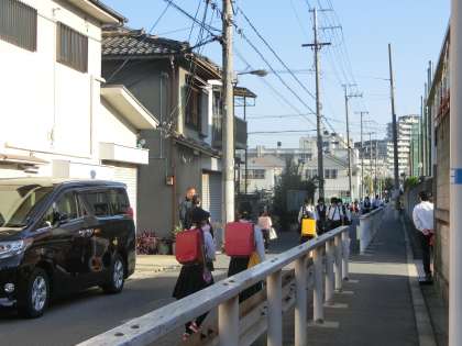 爽やかな気温の中、今日も小学生、中学生が元気よく登校しています。