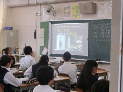 歴史分野。プロジェクターで資料が映し出されています。