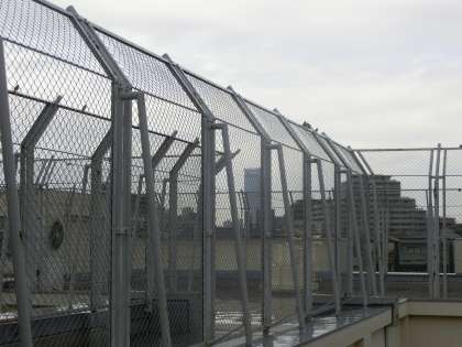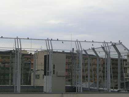 校舎をまわっていると・・・屋上のフェンスに、たくさんのスズメが。