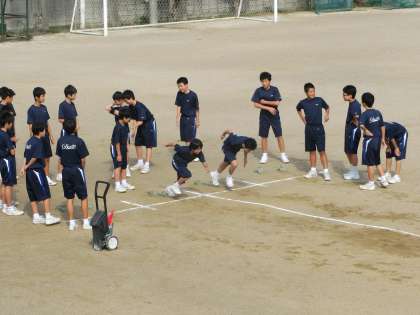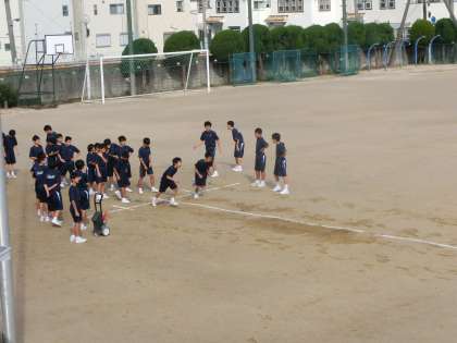 すっかり水の引いたグラウンドで体育が行われています。