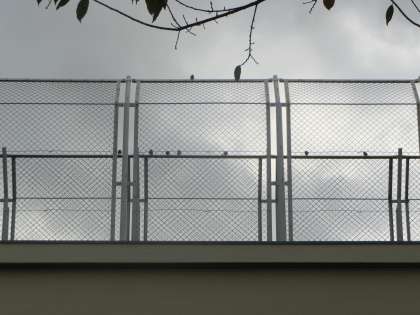 校舎屋上に鈴なりになるスズメたち。