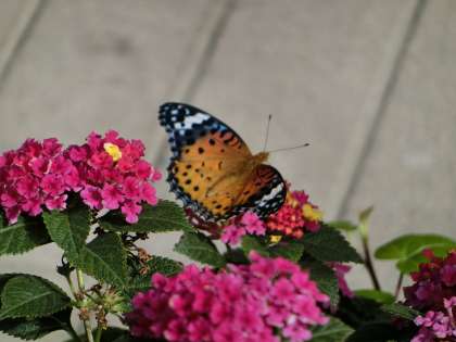 変わった色合いの蝶が、花に誘われて、やって来ました。