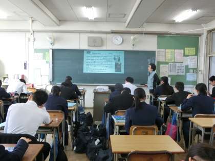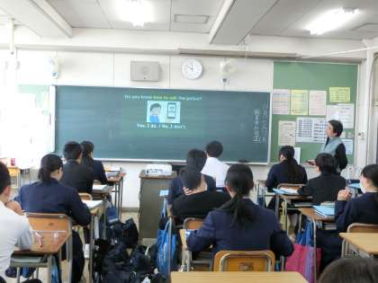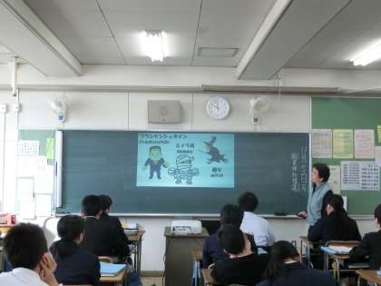 黒板に、パソコンやプロジェクターを活用し、英文が示されています。