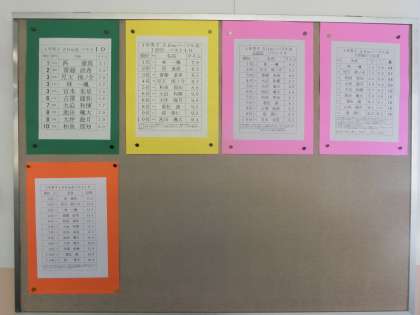 体育の時間に行われる、陸上競技種目の個人記録が、学年ごとに張り出されています。