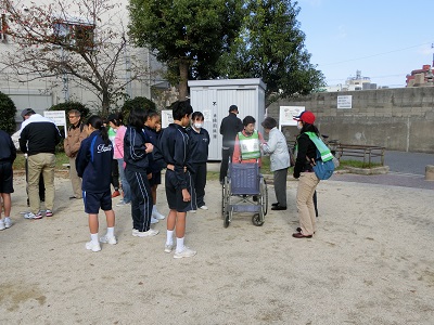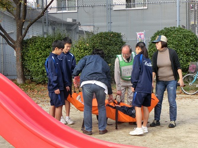 公園では、車椅子、簡易トイレの扱い、簡易担架について体験しました。
