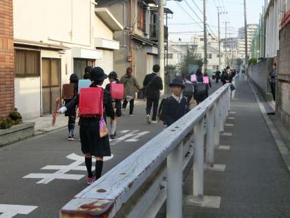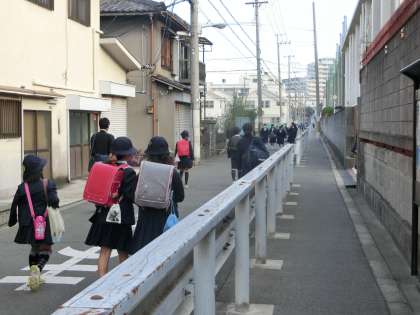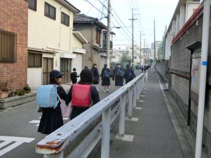 息が白くなる中、児童さん、生徒たちは今日も元気に登校しています。