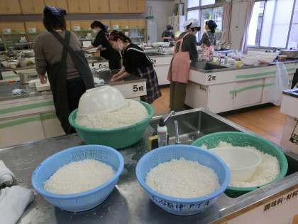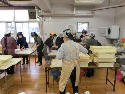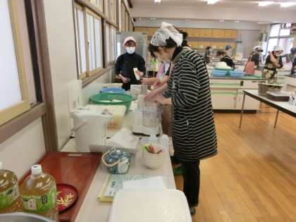 調理室内では、豚汁班ともち班に分かれ、皆様懸命に。