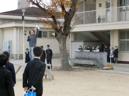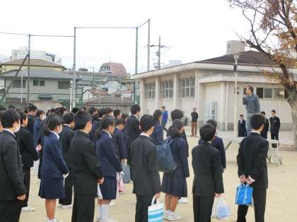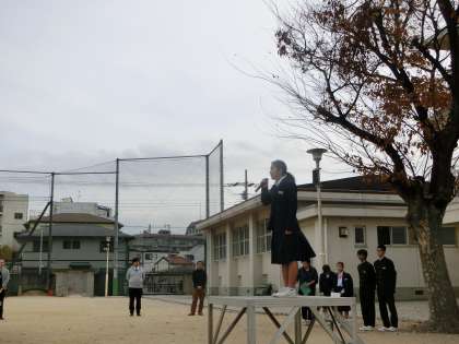 校長から大領祭の歴史の説明があり、PTA会長様に豚汁のお話をいただき、生徒代表から「感謝して、しっかりいただきましょう」の宣言がありました。