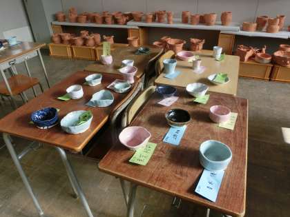 革細工の工芸品や陶器など、生徒たちの力作がズラリ!