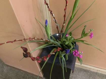 寒い中でも、生き生きと咲いている活け花。