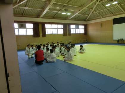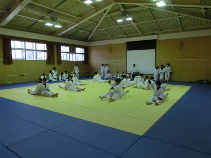 格技室では、男子体育の柔道です。
