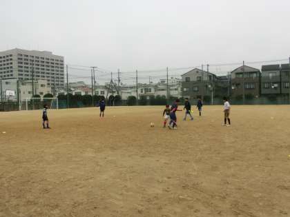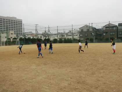 曇り空で、肌寒い中、ボールをみんなで追っています。
