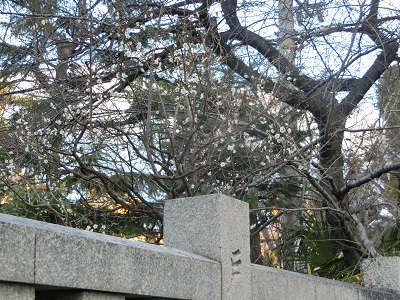 境内の早咲きの寒梅が、すでにほころんでいます。