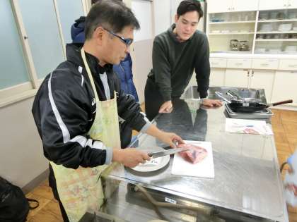 まな板と包丁を使って、肉を切る作業からです。