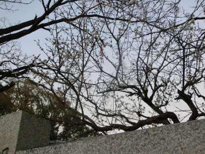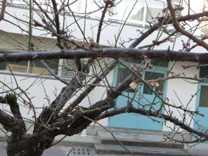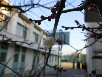 校庭の寒梅。つぎつぎに蕾が膨らみ開花も。