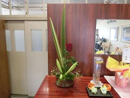 今回は、深紅の薔薇と、百合・かすみ草が主役です。