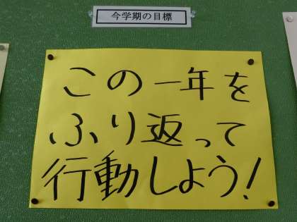 1年生の掲示板。三学期の目標が掲示してあります。