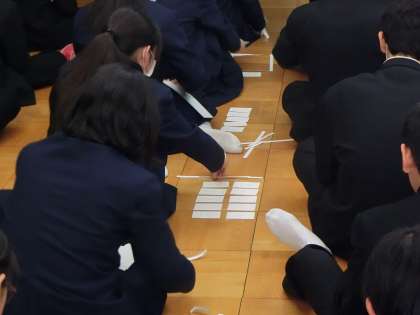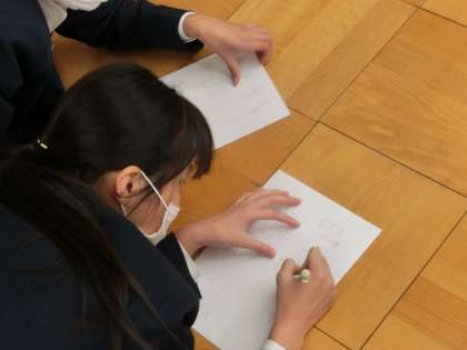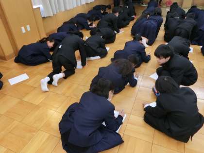 生徒たちは用紙を配布され、スタッフさんの指示で項目を記入し、切り取って並べていきます。