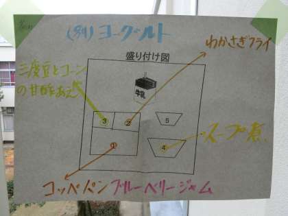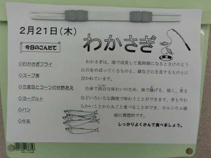 今日のメニューは「わかさぎフライ」「スープ煮」「三度豆とコーンの甘酢あえ」にヨーグルトがつきます。