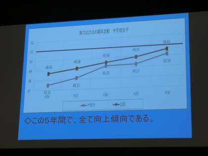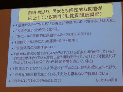 そして、全国平均に近づきつつあり、生徒質問紙から、「運動・スポーツが好き」、「体育の授業は楽しい」と答える生徒の割合が向上しています。