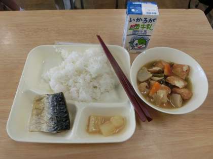 本日のメニューは「鯖の塩焼き」「厚揚げと里芋の煮物」「大根の味噌煮」です。