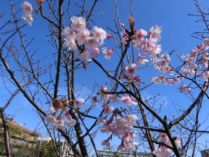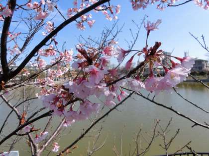 万代池で、早咲きの桜にお目にかかりました。