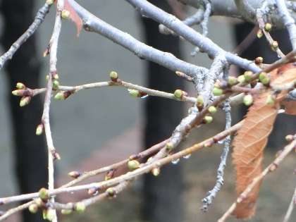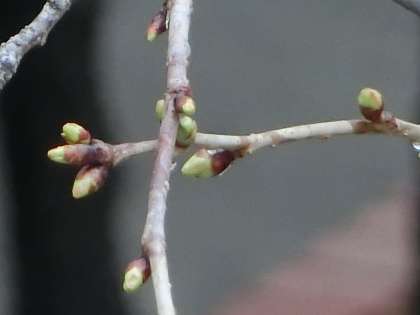 中庭の桜。日当たりの良いところは、かなり蕾が膨らみました。