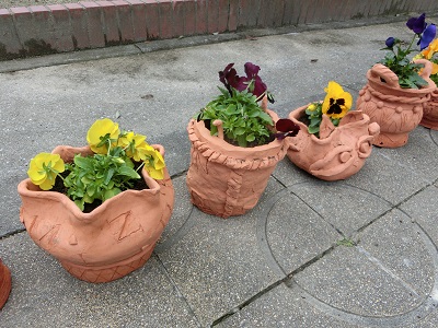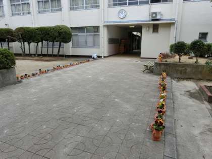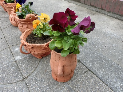 卒業式の花道で使われるパンジーの鉢植え。