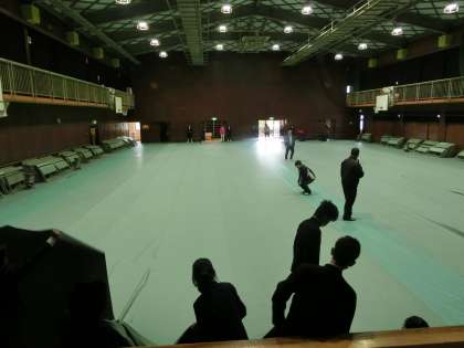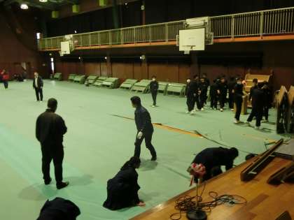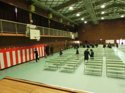 体育館では、1年生が中心に、式場の本設営を行いました。