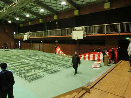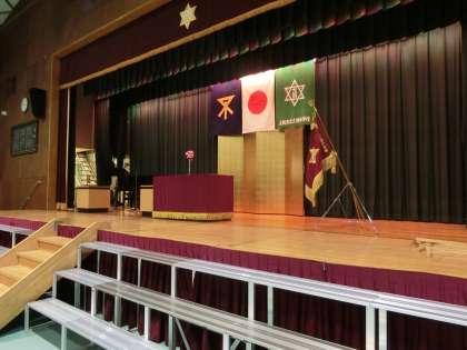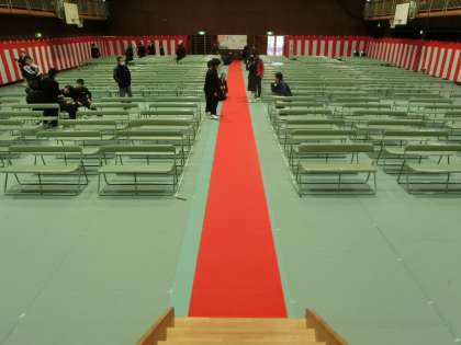 シートが引き直され、張り出し舞台が設置され、長椅子をていねいに並べます。