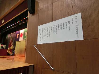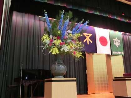 舞台上に豪華な花が飾られ、式次第も掲示されました。