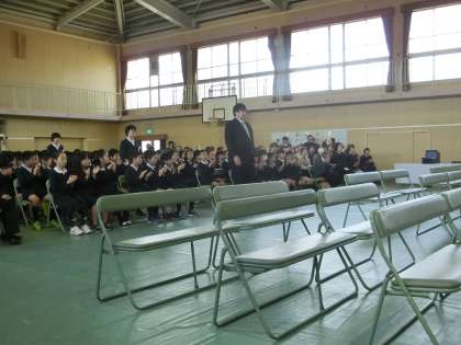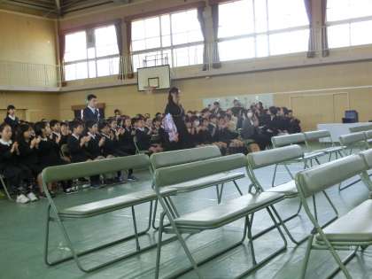 担任の先生を先頭に、3学級が拍手のもと入場し、勢揃いしました。