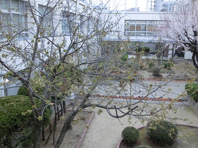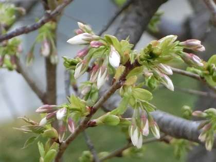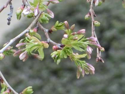 若葉とともに、うっすらピンクの花びらが見えてきました。