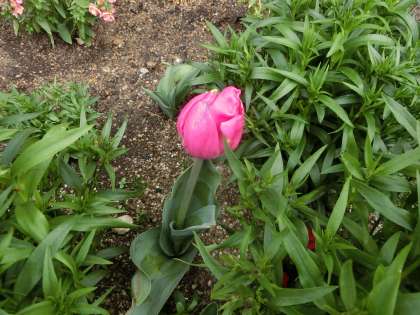 4月4日の入学式を控え、体育館前の赤いチューリップが準備を始めました。