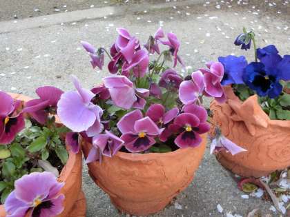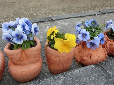 色とりどりのパンジーが、手作りの鉢植えに入って、入学式を待っています。
